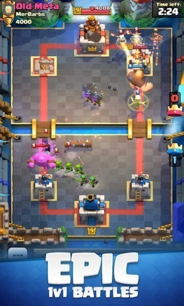 皇室战争国际服是一款融合实时对战与卡牌构筑的策略。玩家需根据战场形势灵活组合八张卡牌,通过部署单位、释放法术和操控王子等英雄展开攻防博弈。每局双方各守三座塔,率先摧毁对方两座塔或在时间结束时塔血量更高者获胜。战斗节奏明快,单局时长稳定在三分钟左右,保持长期可玩性与竞技新鲜感。