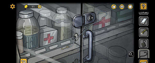 再次回到医务室,原来放着的托盘还在原地,上面摆着一本蓝色封面的册子。翻开册子的左侧页面,上面有几个猩红的字母,颜色鲜艳得让人眼睛发疼。按照这些字母的顺序,我打开了左边的药柜,从里面拿出一把黄铜材质的钥匙。把这把钥匙插进下方的小锁里,只听见“咔哒”一声轻响,锁就打开了,里面躺着一字螺丝刀头和SG-01钥匙,它们并排放在一起。我把十字刀头卸下来,换上刚拿到的一字刀头,然后对准右边柜子顶部的螺丝,转动螺丝刀,把螺丝拧松取了下来;接着用铁丝伸进柜子的缝隙里,勾出了一枚小巧的钥匙。