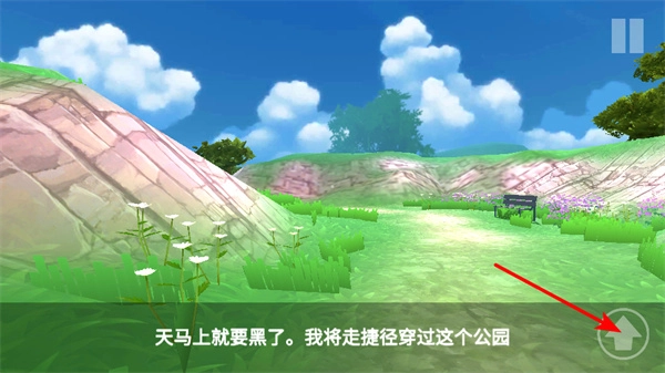 推进剧情时,点击箭头按钮来推动游戏剧情发展,这一操作关联着选择走捷径穿过公园这一决策的背景设定。