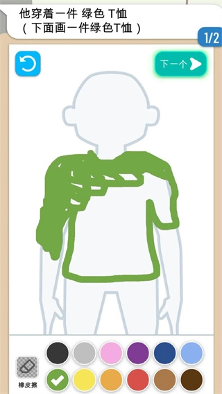按照提示挑选绿色颜料,顺着虚线画出绿色T恤,完成服装的绘制工作,这是还原形象的关键步骤。