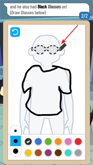 挑选黑色颜料,顺着虚线勾勒出黑色眼镜,把嫌疑人的面部特征补充完整,为后续的识别工作提供帮助。