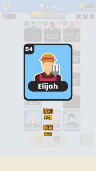 2、每个关卡都会公开一张卡牌,玩家可依据这张公开卡牌所提供的信息展开推测,然后点击下方的“好人”或“坏人”选项来操作其他卡面。