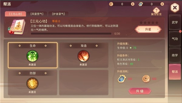 最后,我们再来了解一下“帮派武学”。帮派武学包含三重核心心法,分别是“三元心功”“风雷罡气”和“护体罩气”,每一种心法都与特定的角色属性相对应。侠士在加入帮派之后,能够消耗帮派贡献与铜钱来提升心法等级,而随着心法等级的逐步提高,侠士自身的角色属性也会得到对应的增强。