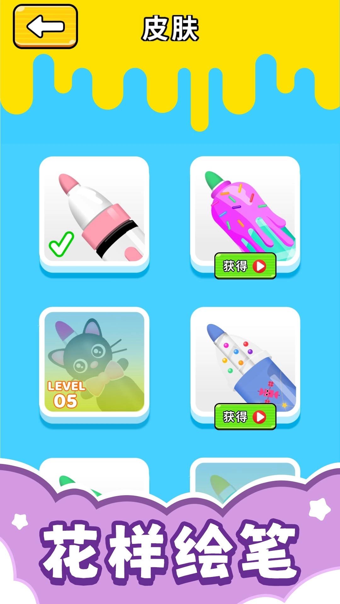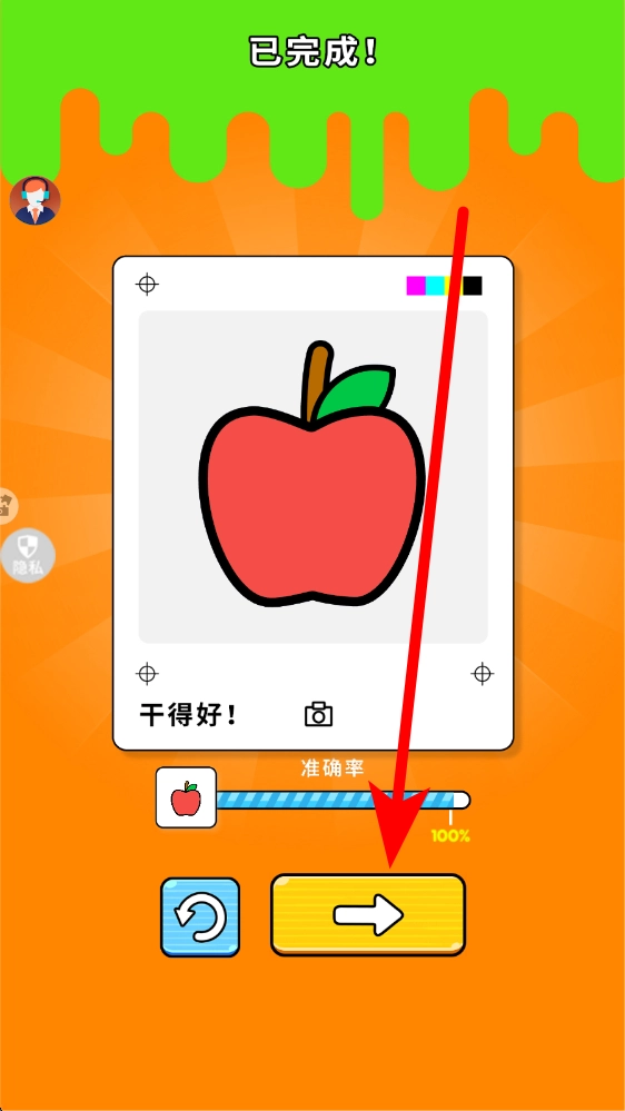 当绘画和填色全部完成后,要是达到了要求,就会显示已完成,这时候可以点击箭头按钮,进入下一个关卡,继续开展新的绘画创作,体验更多绘画乐趣。