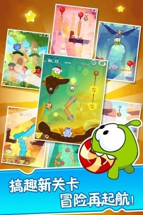 2、核心可爱小精灵是人气角色小怪兽 Om Nom,有着圆滚滚的身形、灵动的大眼睛和软萌的绿色毛发,走路时的憨态、吃到目标物品时的满足表情等细节设计,让这只 Q 萌感拉满的小家伙极具亲和力,不管是低龄玩家还是成年用户,都能被它讨喜的形象所吸引。