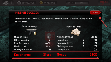 4、任务完成后,可查看【Experience】-【314xp】、【Money】-【280$】等奖励内容,点击【CLOSE】按钮即可解锁后续任务。