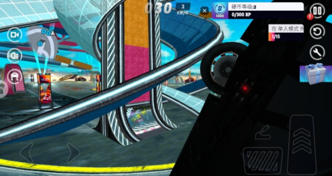 3、借助虚拟方向盘与特技按键操控赛车,实现加速、漂移以及空中翻转等动作。