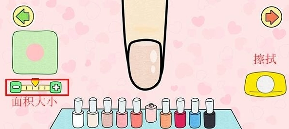 4、每一个指甲都支持自定义颜色分布,左侧能调节指甲油的点触尺寸,右侧则可用来擦除多余的颜色。