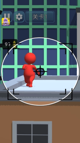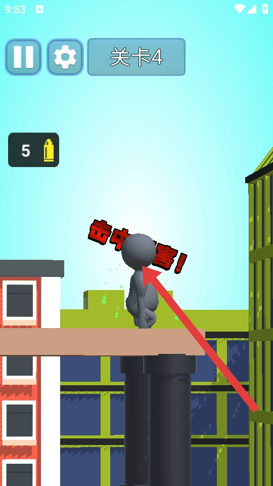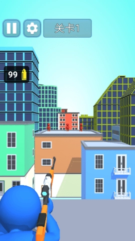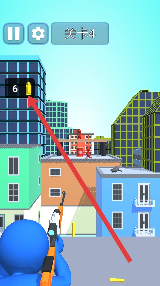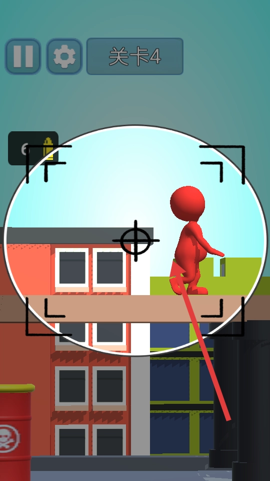 进入第四关后,先留意场景的整体布局——屋顶上分布着红色敌人和油桶等物体。接下来需要滑动屏幕来调整狙击枪的视角,同时利用建筑之间的空隙来获取更清晰的视野。
