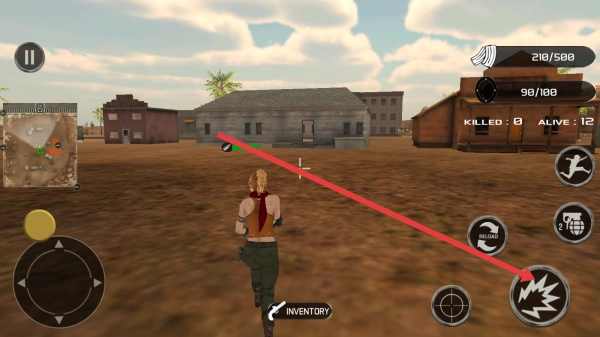 当遭遇敌人时,使用右侧的攻击键进行射击;若受到攻击,可通过点击跳跃键或跑步图标来调整走位;小地图左侧出现红圈标记的位置即为敌人所在处。