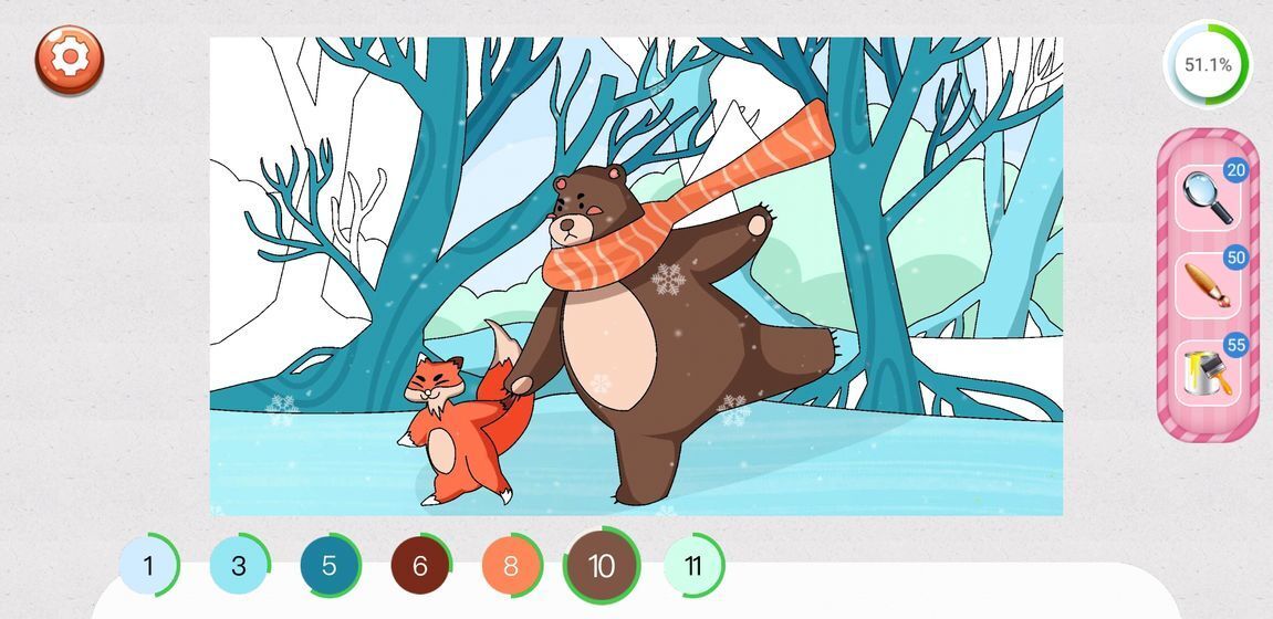 1、图案填色基础:点击调色板选取颜色,手指滑动完成区域填充,系统自动识别闭合区域防止颜色溢出。长按可放大细节进行精准涂色。