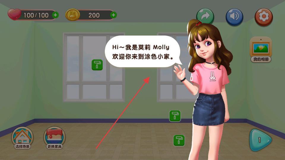 1、进入游戏看到角色莫莉的欢迎提示,了解游戏场景为涂色小家,显示爱心与金币数量,准备开始涂色相关操作。