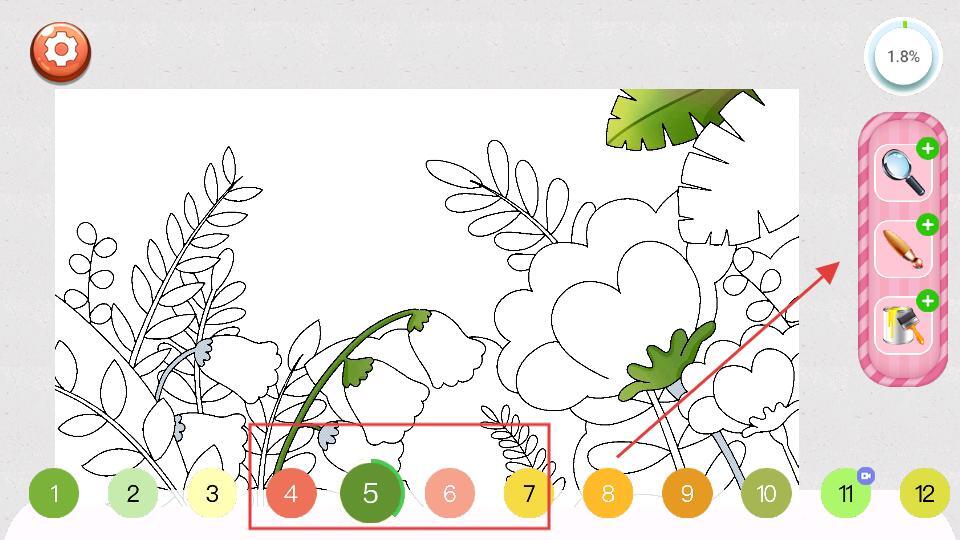 4、在涂色界面选择下方的颜色数字,如数字5等,再配合右侧的画笔、放大镜等工具,对画面中的花草图案进行涂色,逐步完成花团锦簇的涂色任务。