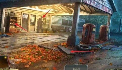 来到下街道后看到一个鬼鬼祟祟的人,点击他他就会快速离开,我们在左边柜子里获得线索,同时在加油机处获得了木板,我们返回镇上。