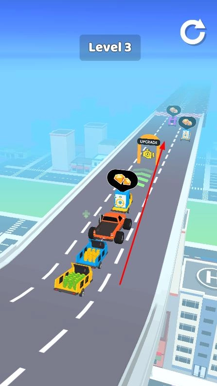 在Level1这类关卡中,驾驶时要收集沿途的车辆来组建车队,并且得留意避让其他车辆。