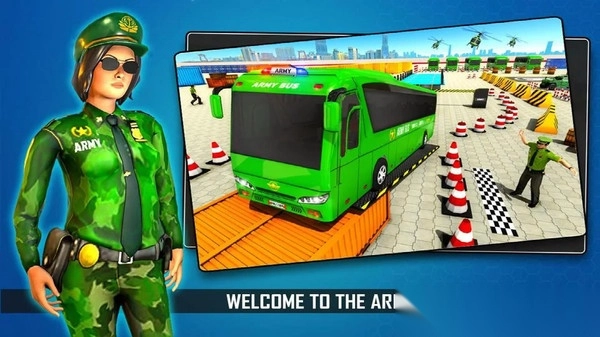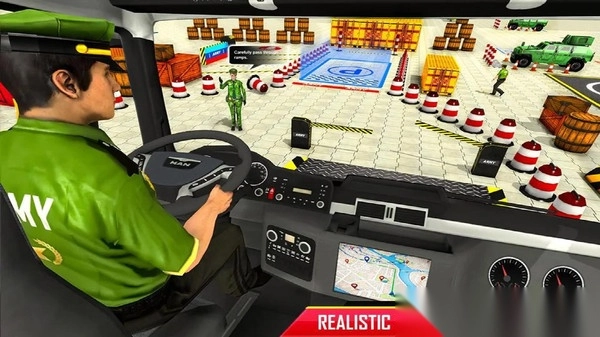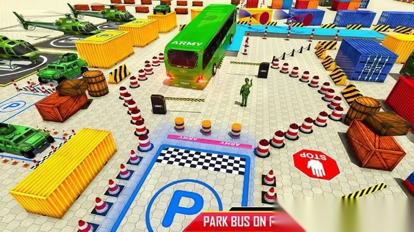 在军车驾驶模拟器游戏里,你得操控军用巴士,把它准确停到标有【PARKING】字样的指定停车位上。