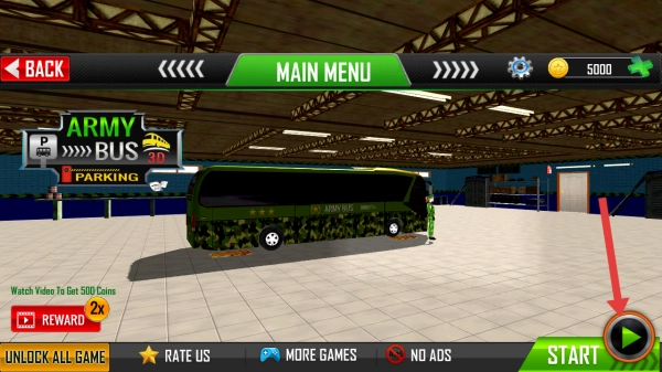 在军车驾驶模拟器的主菜单界面,点击右下角的【START】按钮,就能开启军事巴士停车游戏的冒险之旅。