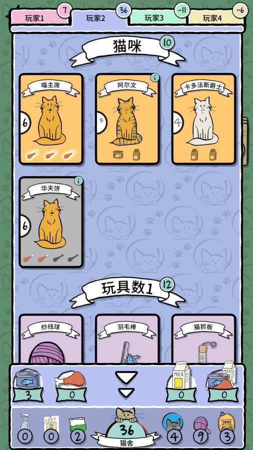 在这款游戏里,你和你的猫女伙伴每回合能抽3张牌,把玩具、食物、猫薄荷、服饰,以及那些软萌的猫咪们都收集起来。