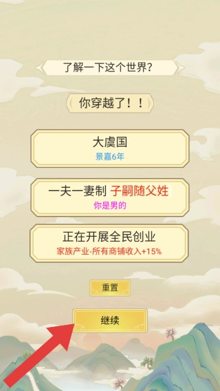 呈现穿越到大虞国景嘉6年等初始设定,有一夫一妻制、全民创业等规则,点击【继续】可开启家族模拟经营。