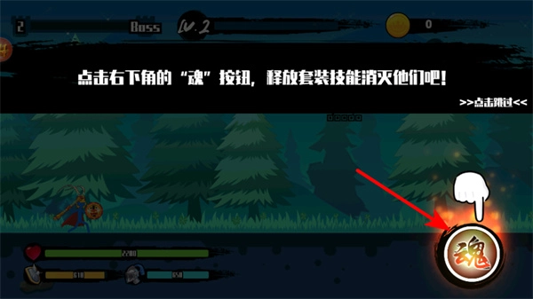 3、遇到BOSS战等强敌时,点击右下角魂按钮释放套装技能,这是快速清场的关键操作,释放时需把握时机,确保覆盖所有敌人。