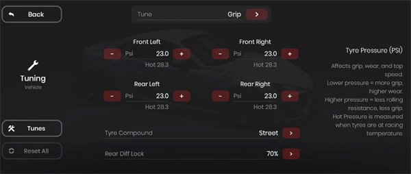 点击“Tuning”选项来调校车辆,完成调校后车辆的操控性能会得到提升。