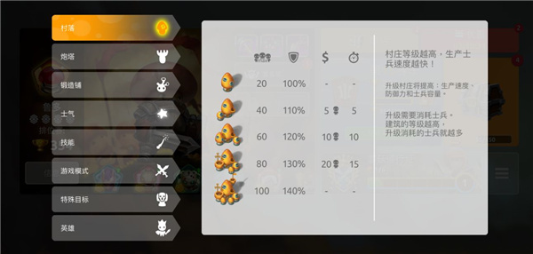 每个村庄从1到5有五个可改善等级,并有一系列数值要点:防御值、单位发兵最高限额、单位发兵速度、改善成本和改善持续时间。