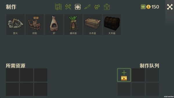 打开制作界面,挑选篝火、织机这类基础道具,消耗相应的资源后点击制作按钮,以此来完善生存所需的设施。