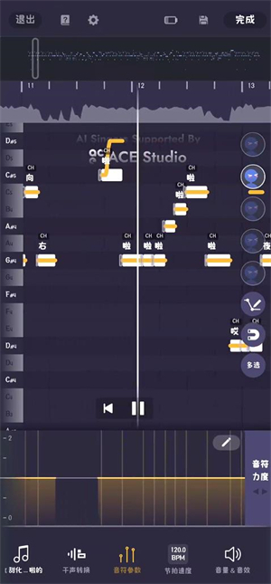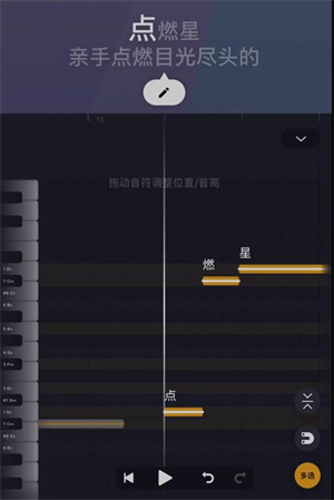 2.第二种方法是在调教界面通过上下拖动音符实现变调,该方式对已录制的内容同样有效。操作步骤为:点击调教界面,选择多选功能,接着点击第一个按钮展开音阶钢琴卷帘,随后即可拖动音符调整音阶。