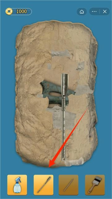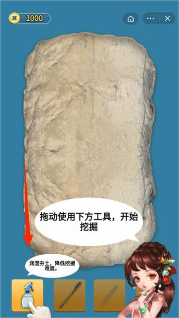进入挖掘界面后,拖动工具清理石块,就能逐步发掘出隐藏的青铜器文物。