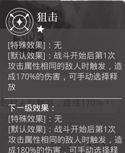 (4)狙击:当遭遇同属性对象时触发效果,对目标造成单次百分比伤害,该效果的触发次数不受限制。