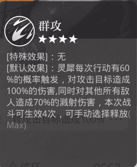 (1)群攻:群体伤害,单次造成伤害,有概率触发,一局游戏内触发次数最多为4次。