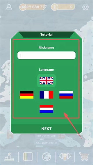 当看到屏幕上的“NEXT”按钮时,点击该按钮,接着进行国旗选择与昵称输入的操作。