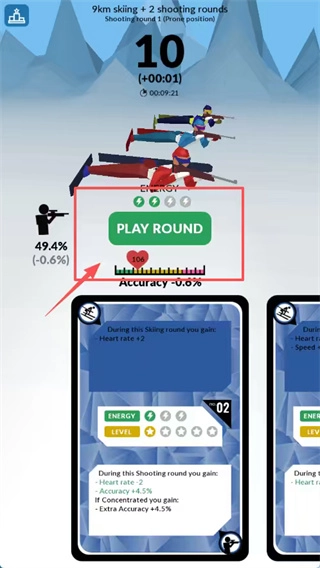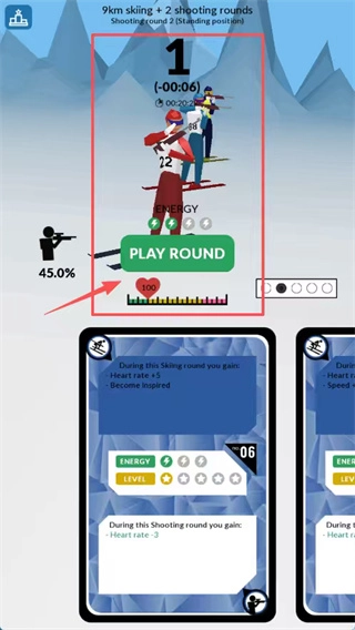 在倒计时界面设有“PLAY ROUND”按钮,需留意心率达到100以及命中率为45%这两个指标。