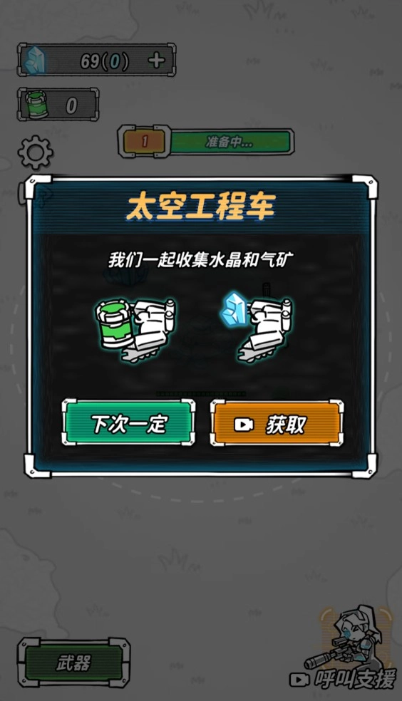 1、进入游戏后,点击开始游戏即可开启采集之旅,在正式开始前,可以通过看广告的方式获得太空工程车的帮助。