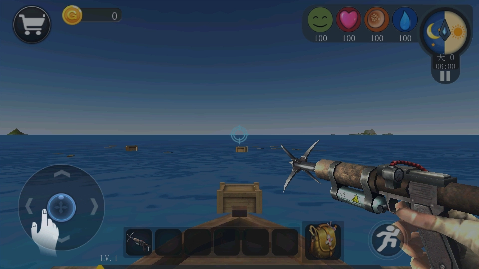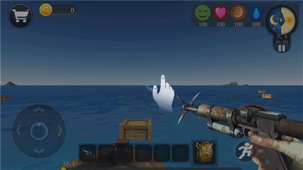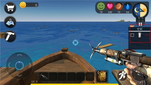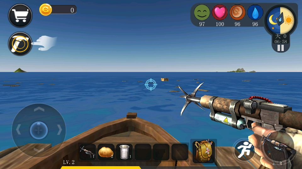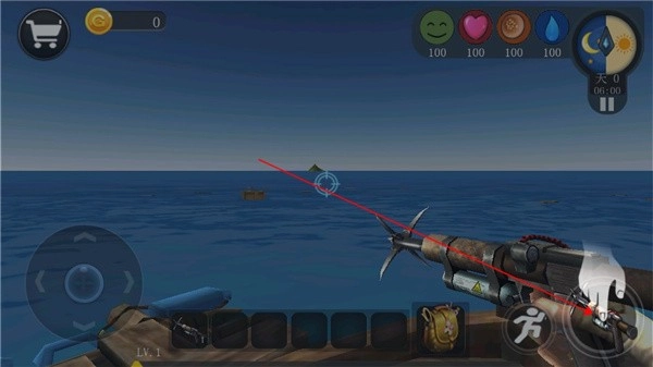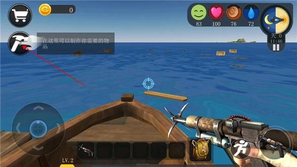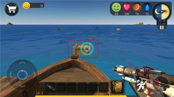 3、进入游戏后,玩家会重生在小船里,你可以用钩锁枪获取物资;