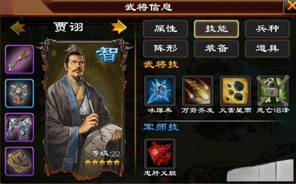 贾诩的属性其实比较普通,不过对零元党来说算是个福音,他的军师技能能提升招降概率!清兵技能没什么实际作用,但火雷要是五发能中三发,通常就能打掉对手一半血量了!大招可以对大片敌人造成固定减血和中毒效果,也还算好用!