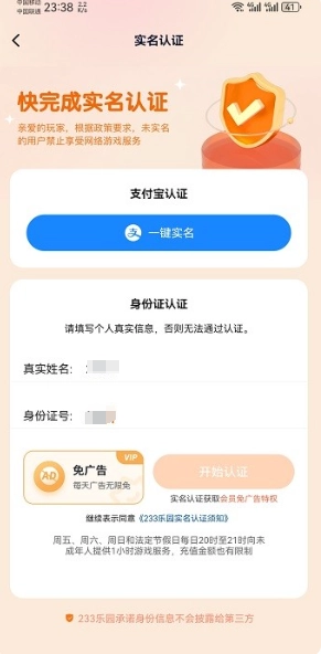 1、233乐园初次进入的玩家,需要完成实名认证;