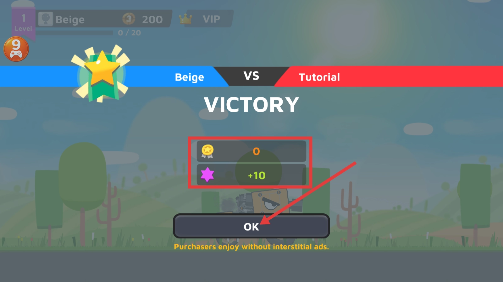 胜利后点击【OK】按钮,就能领取10颗星星的奖励,接着继续挑战来提升等级,这样就能解锁更多坦克和玩法了。