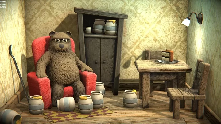 2、你会看到红沙发上的小熊,它懒得不想动弹,一心想去吃蛋糕。