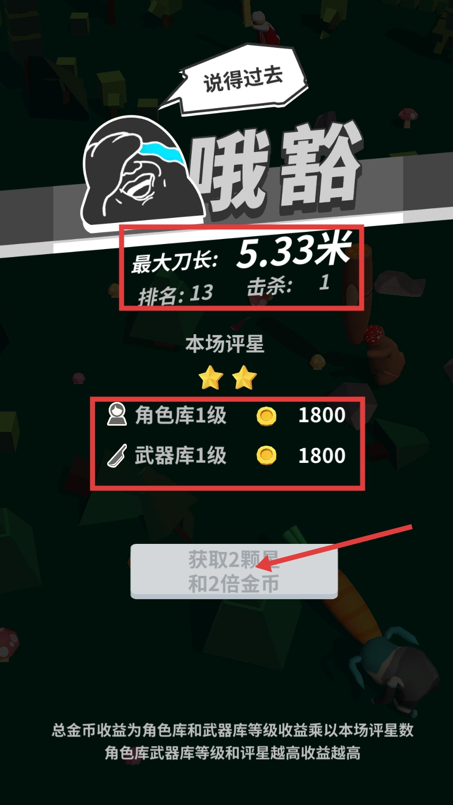战斗结算时留意【最大刀长-5.33米】这类数据,借助【角色库1级-1800】【武器库1级-1800】的金币升级功能,来提高收益。
