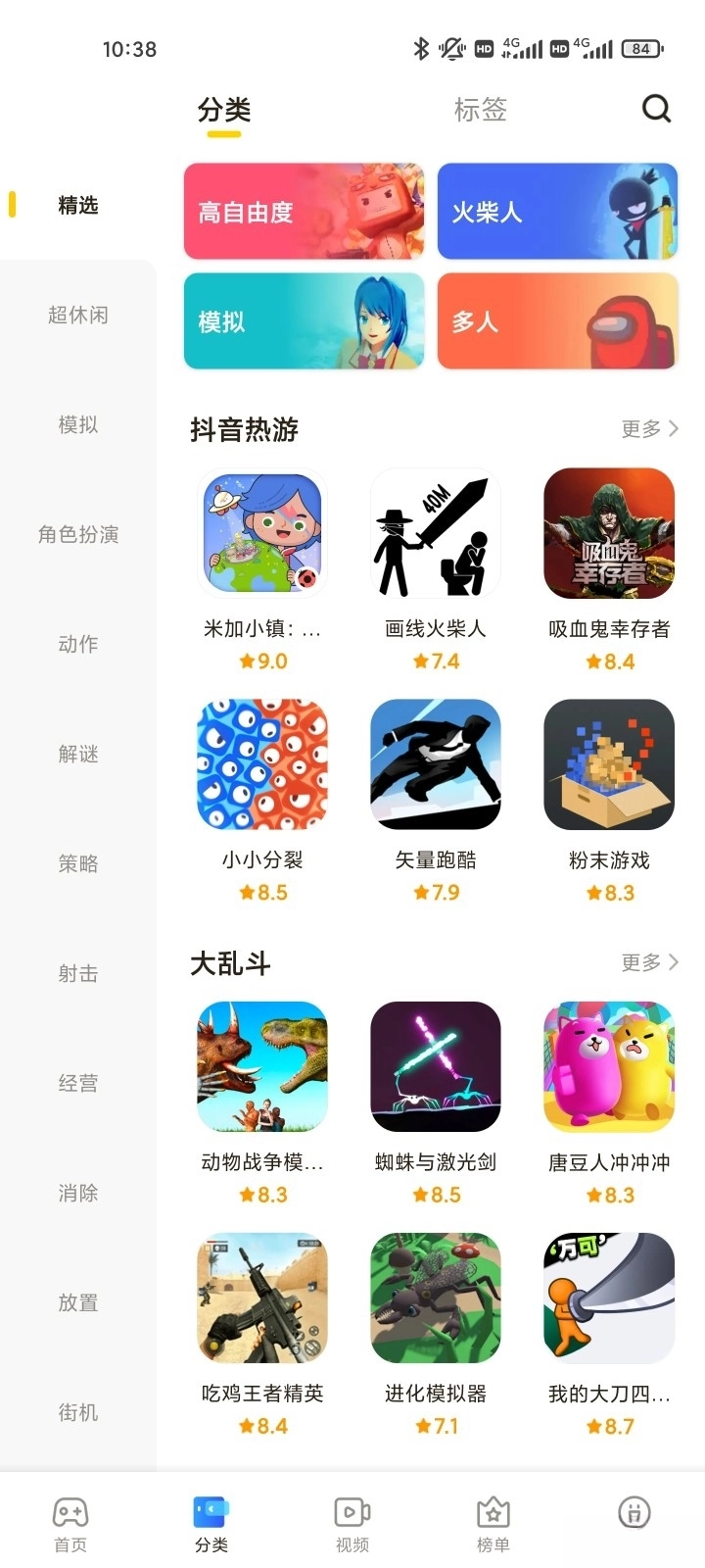 摸摸鱼和常见的商店类App差别不大,首页、分类、榜单、我的这四个主要标签页对用户来说几乎没有上手难度。在细节设计上,摸摸鱼格外重视视频元素,轮播展示的游戏视频介绍非常醒目,它的核心是让玩家以最快速度了解游戏玩法,从而吸引用户尝试。