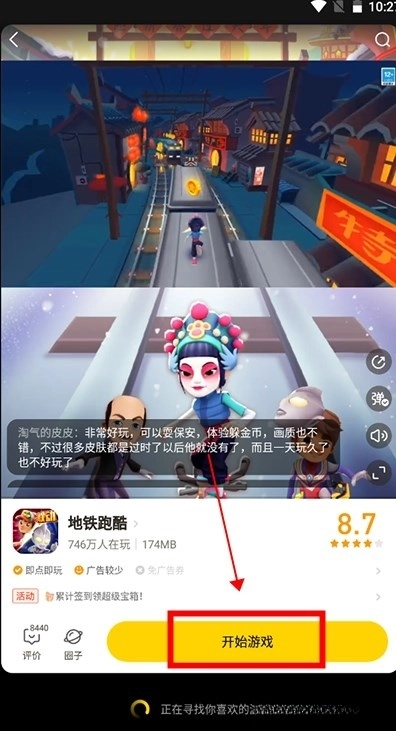 打开摸摸鱼,通过搜索功能查找或直接从游戏列表里挑选你想玩的游戏(这里以地铁跑酷为例),然后点击“开始游戏”按钮。