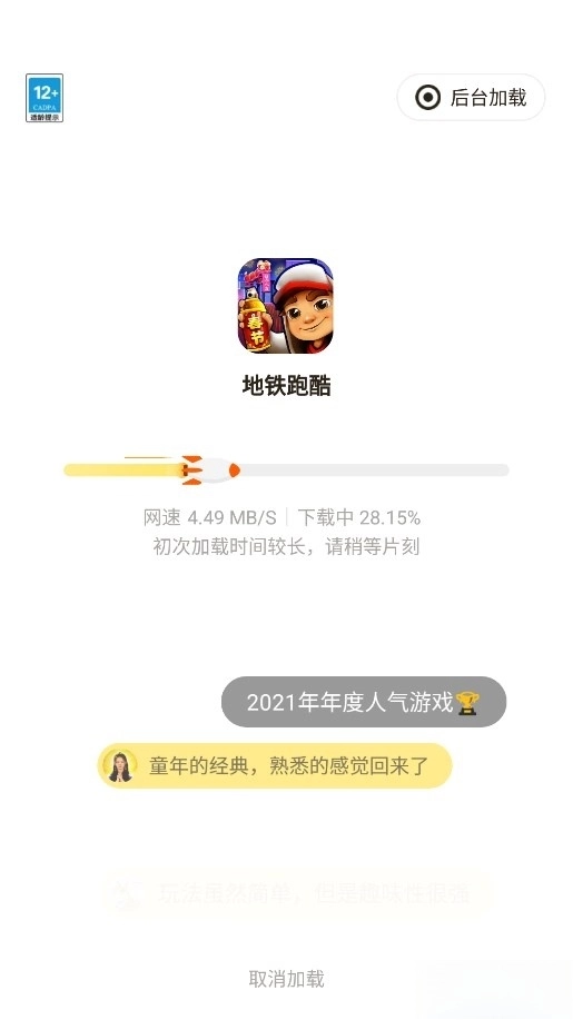 摸摸鱼还把“”这个称呼给禁用了,旗下所有产品都统一标注“打开”二字,目的是从心理层面让用户形成“一点就能玩”的小游戏认知。不过实际随机点开一款叫《死神VS火影绊》的产品时,任务栏还是会显示需要加载一百多兆的内容,只是确实不用经过安装步骤就能直接进入游戏了。