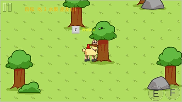 第一个水果朋友被困在这块石头这儿啦,我们得找到蜂窝才能把他弄出来。
