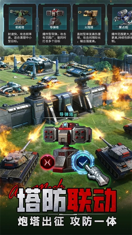 深度融合“传奇军官×定制机甲×百变兵种×要塞炮塔”四维体系,组建闪电突击或钢铁防御阵容,策略始于搭配。