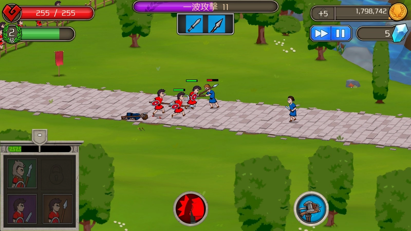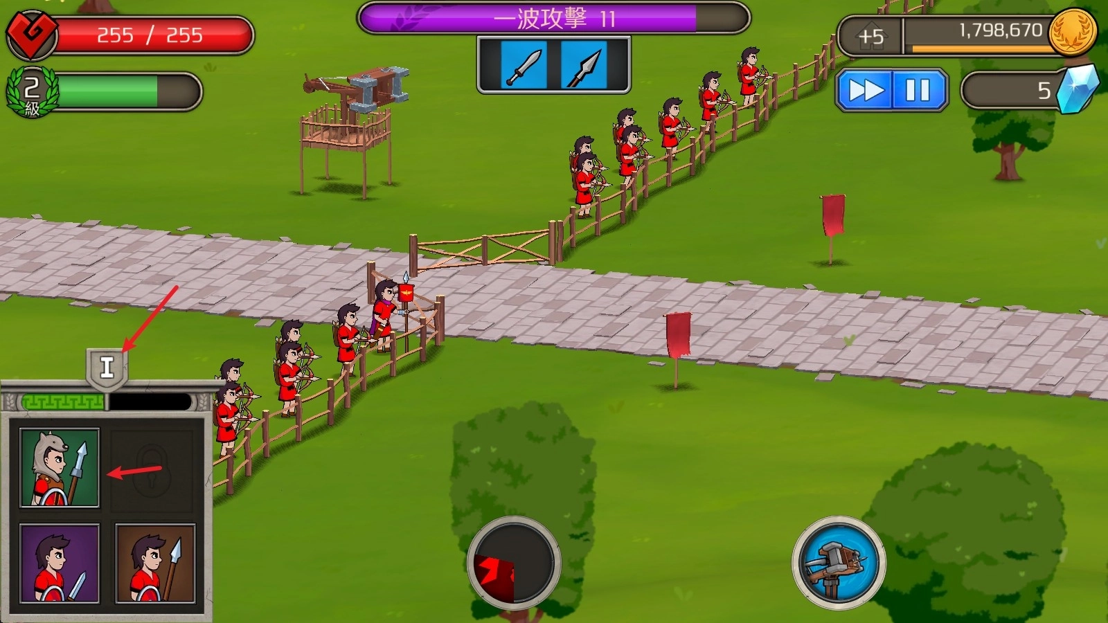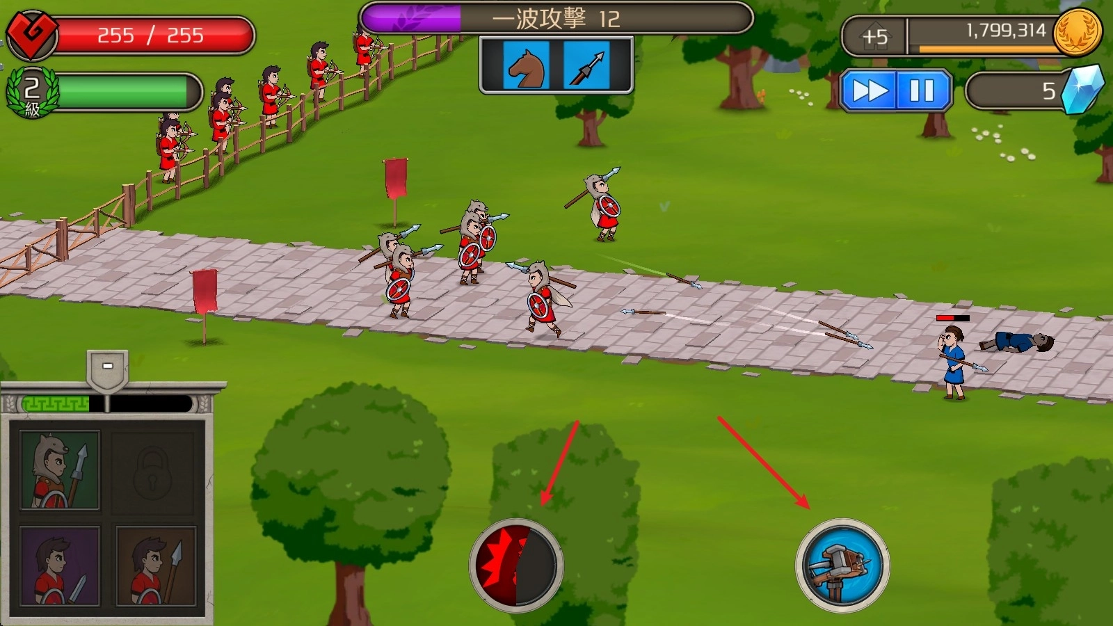 2、战斗开始后,点击左下角的士兵就能进行召唤,上方的数字显示的是可召唤的次数。