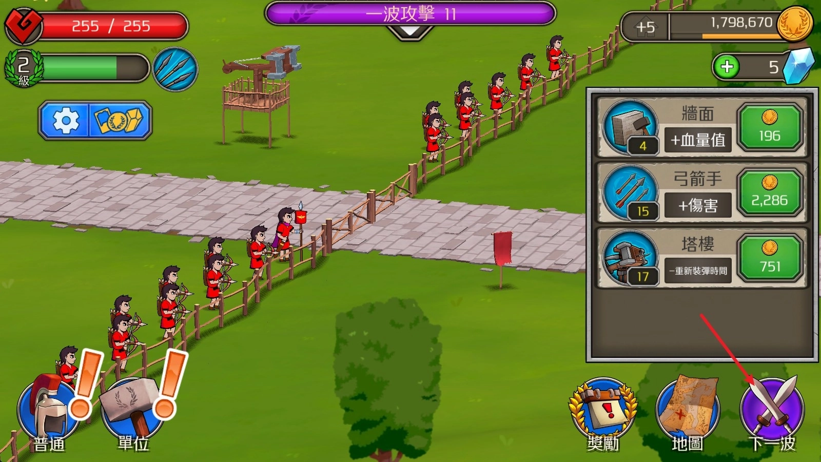 1、开始游戏后,点击右下角的下一波即可开始战斗。
