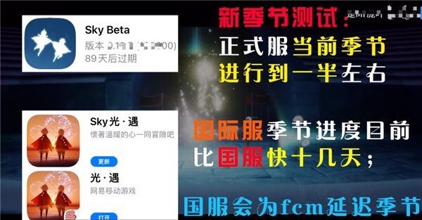 国际服与国服,除彩虹日活动外,其余活动国际服均会先行开启,不过两者开启时间相差不过数日。测试服通常会在正式服当前季节推进至约一半进度时,开启新季节的测试。就季节进度而言,国际服目前比国服快十几天;加之国服因需兼顾fcm而延长季节时长,这也使得国服在进度上注定会处于落后状态。
