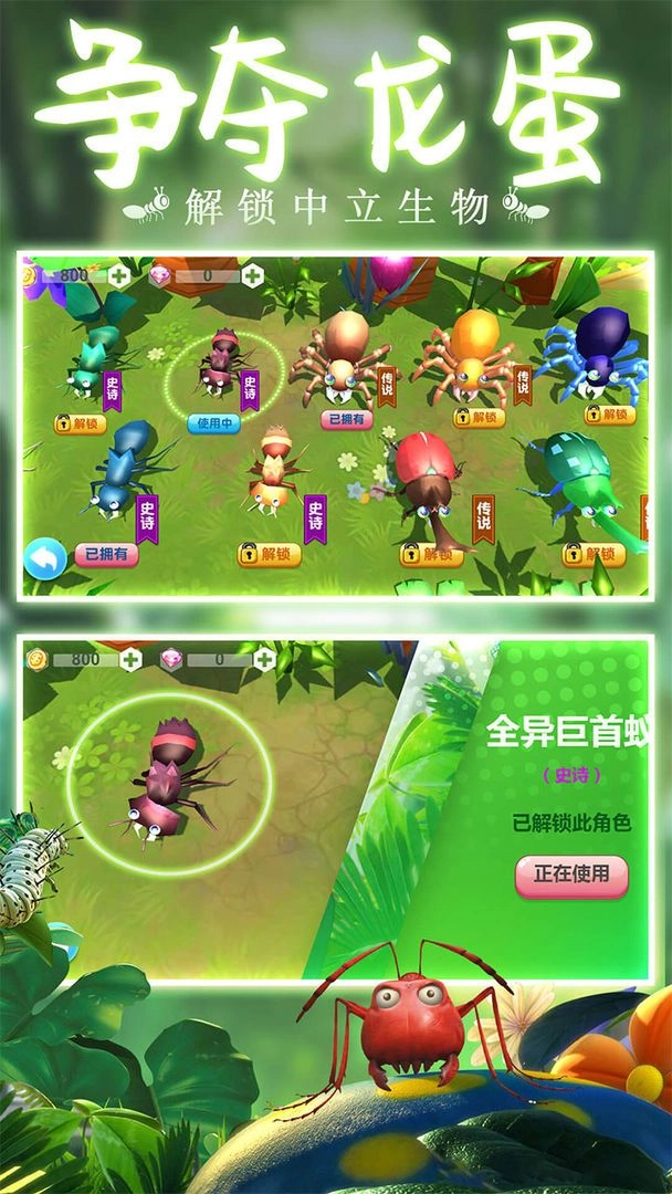玩家能够借助各类道具助力自身快速成长,金币与钻石均可用于升级以及解锁全新角色,形形色色具有特色的蚂蚁和昆虫一应俱全。