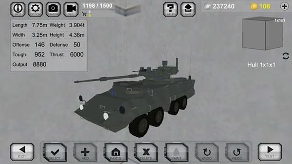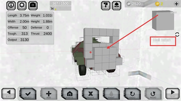 进入车辆编辑界面后,选取【Hull-1x1x1】模块,接着点击底部的【ADD】按钮来添加部件,以此逐步搭建车辆的结构。